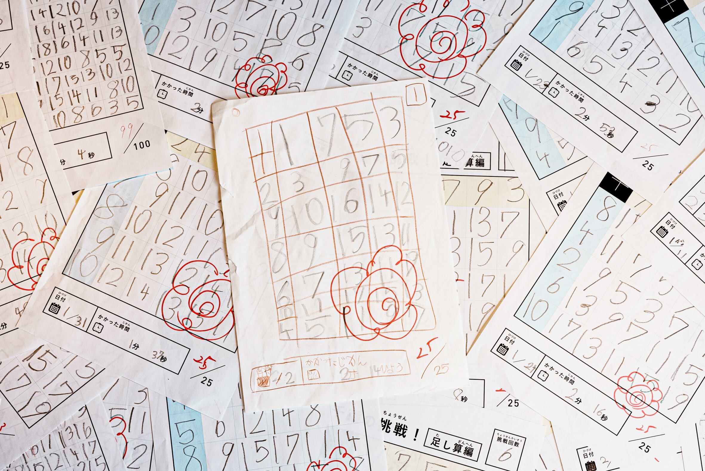面白そうなドリルを買ってみても、親に言われないとなかなか進んで勉強をしない。このままでは勉強が嫌いになってしまうのではないかと心配になり、もっと楽しく自然に自ら取り組める方法がないかと、模索し始めたことがベリーベーシックのマス算と目標シートの始まりです。